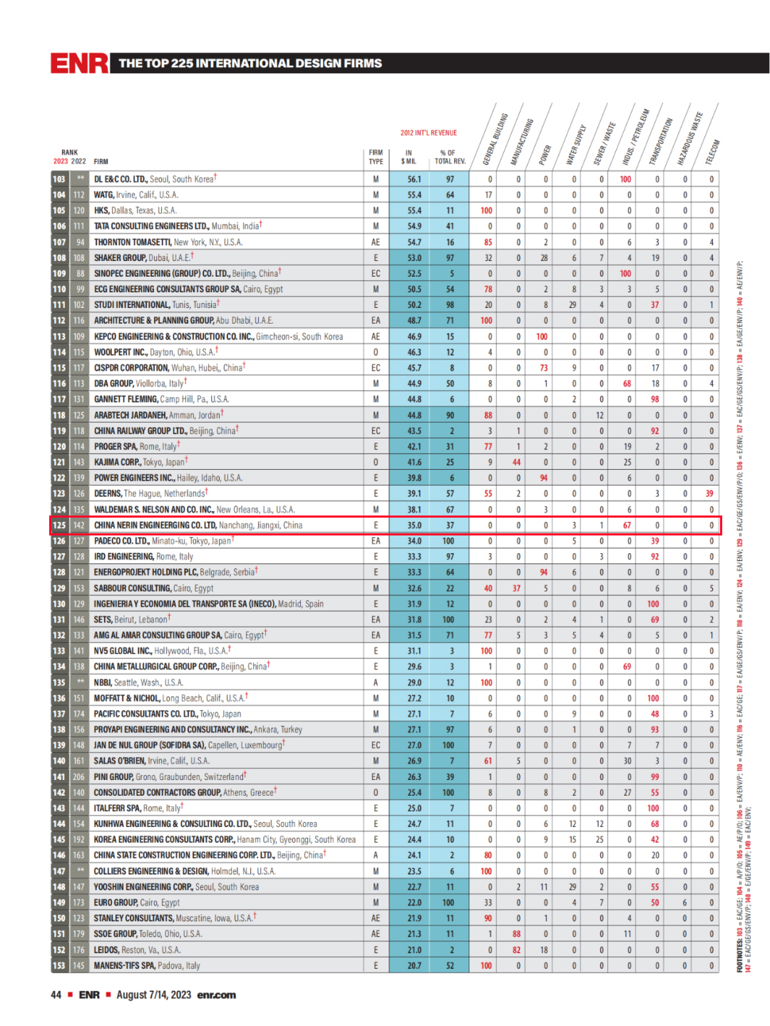 According to a news release by China International Contractors Association, Engineering News-Record (ENR) recently unveiled its Top 225 International Design Firms and Top 150 Global Design Firms rankings for 2023 a total of 23 companies from Mainland China have been listed in the Top 225 International Design Firms, and the number of listed companies is the same with that in 2022. Among them, China Nerin ranked 125th, rising 17 spots from its previous year's position.