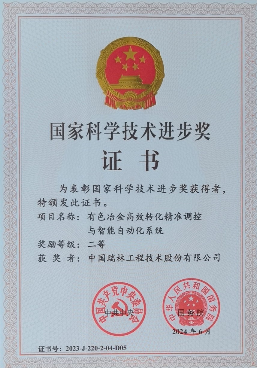 On June 24, the awarding ceremony for the 2023 National Award for Science and Technology Progress was held in the Great Hall of the People. The project titled "Efficient Conversion, Precise Control, and Intelligent Automation System for Non-ferrous Metallurgy" jointly completed by Central South University, Jiangxi Copper Corporation Limited, China Nerin Engineering Co., Ltd., etc. was awarded the second prize of National Award for Science and Technology Progress. This marks the 11th time that China Nerin has received a National Award for Science and Technology Progress.
